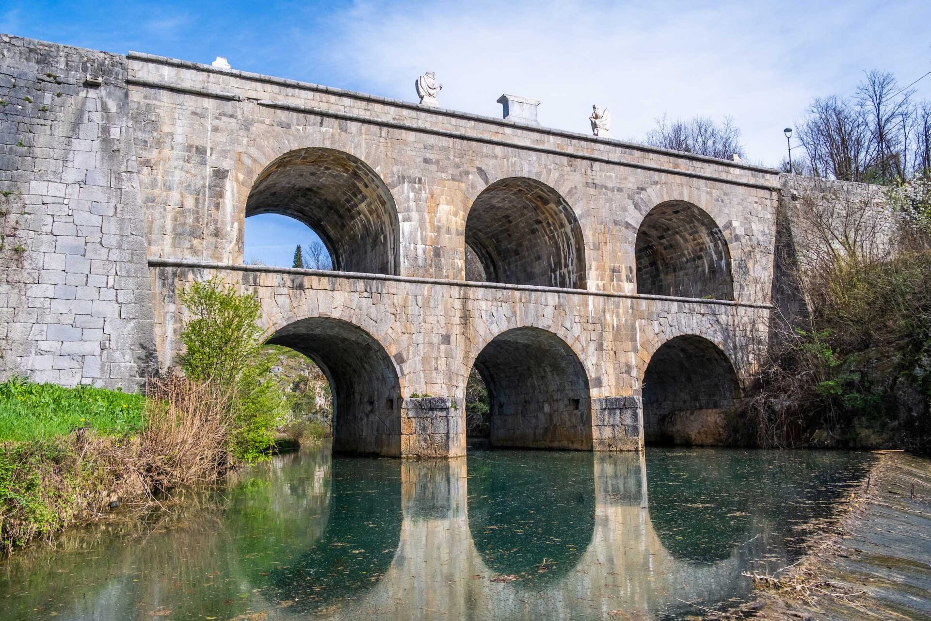 Izgradnja prvog kata mosta dovršena je 1777. godine prema nacrtima Vinka Struppija, u sklopu gradnje ceste Jozefine. Drugi kat je izgrađen 1845. godine, u vrijeme gradnje nove ceste pod vodstvom Josipa Kajetana Knežića. Razlog dogradnje nije bila samo povećana nosivost, već i potreba za ublažavanjem velikog uspona na prilazu mostu kako bi se olakšao promet zapregama. Ova dvokatna struktura izrađena je od lokalnog kamena, što dodatno naglašava njegovu povijesnu i kulturnu vrijednost.